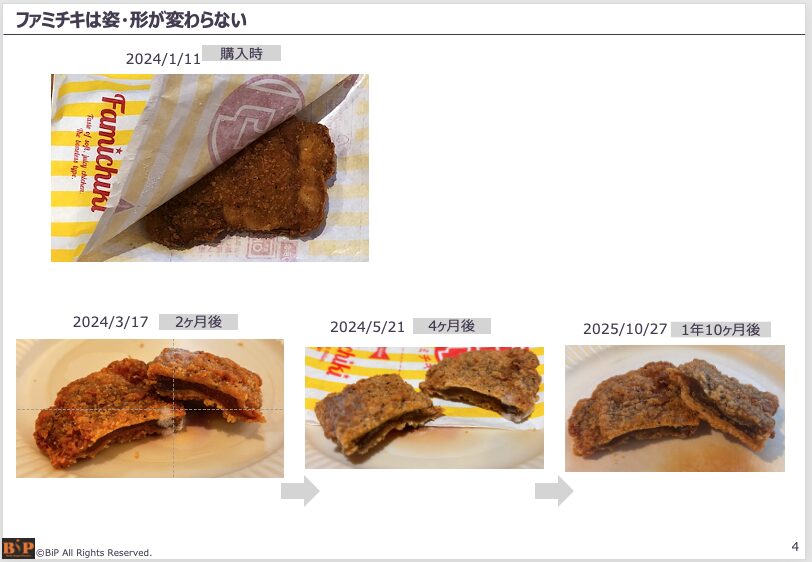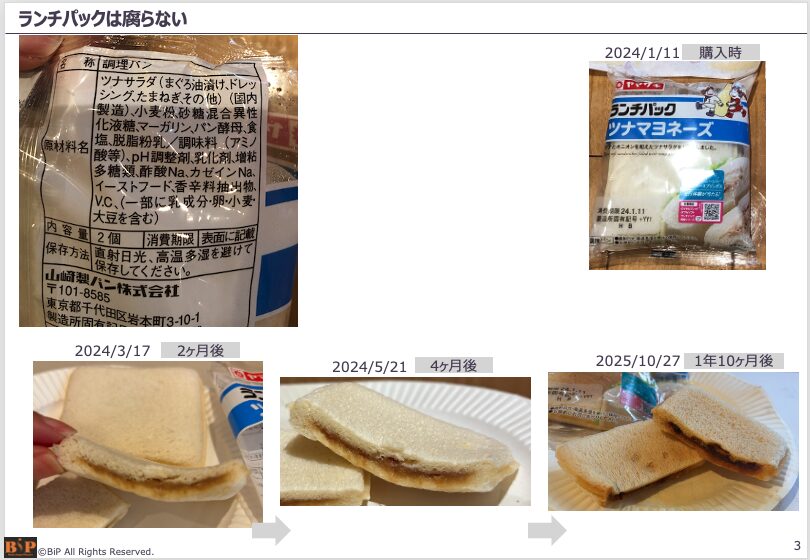 コンビニで購入した以下の食品を、室内の常温下で保存し