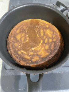 【4】全体的に火が通り、フライパンに張り付いてる感じがなくなったらひっくり返します。